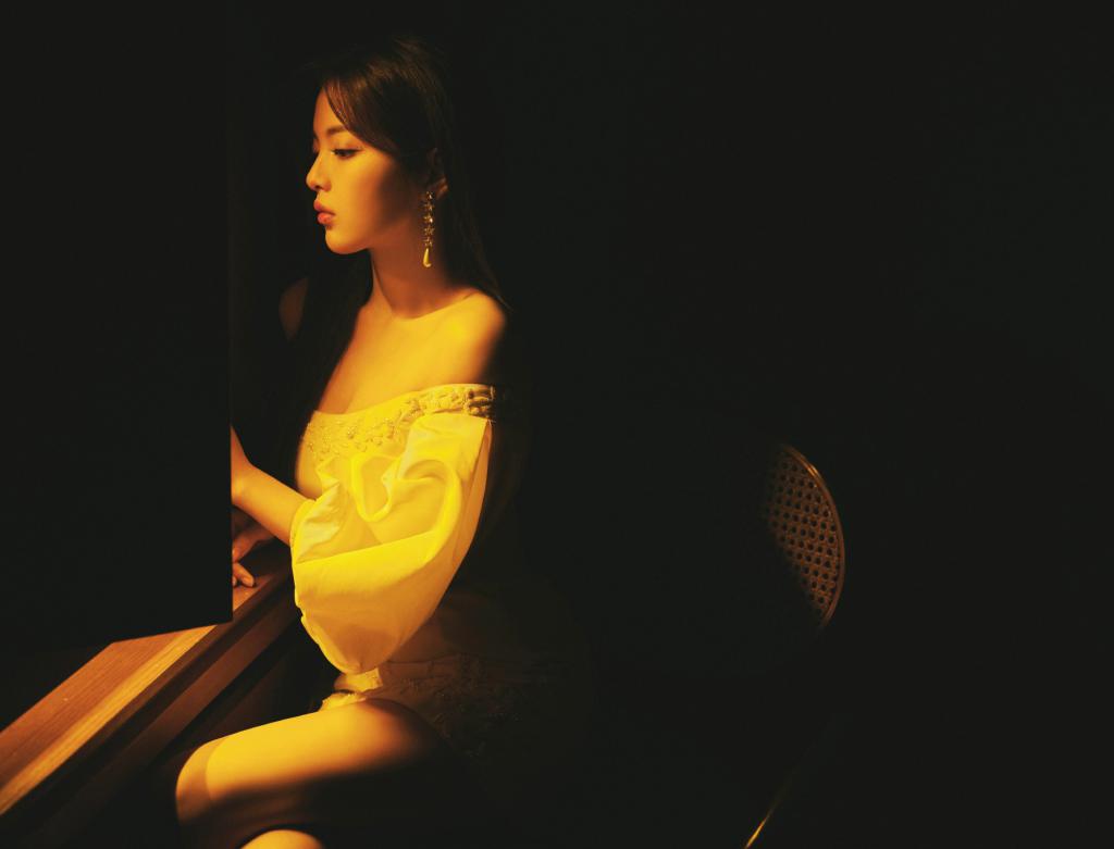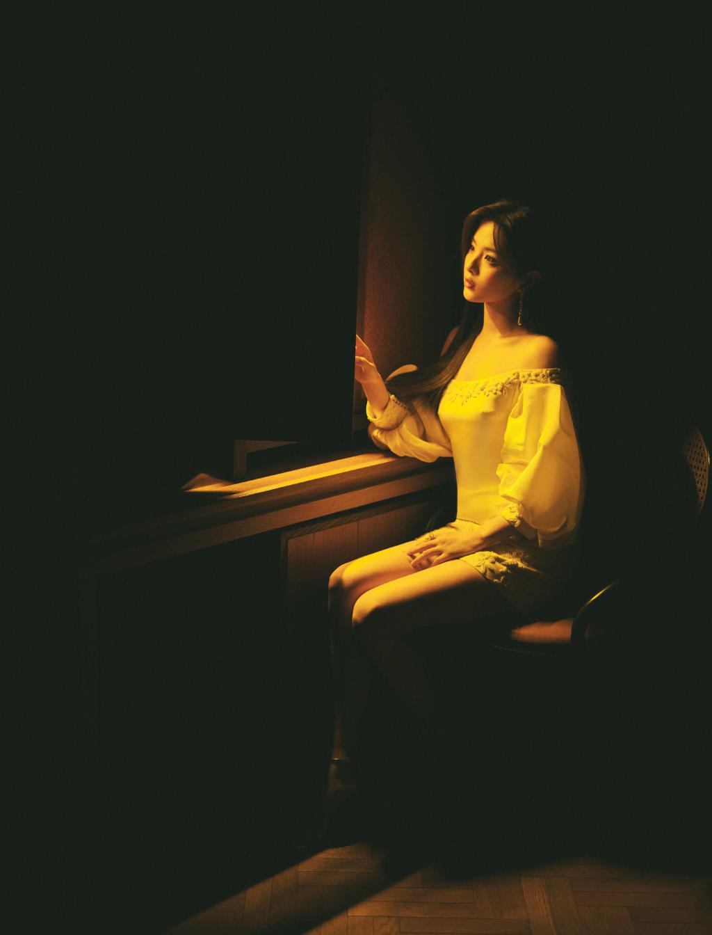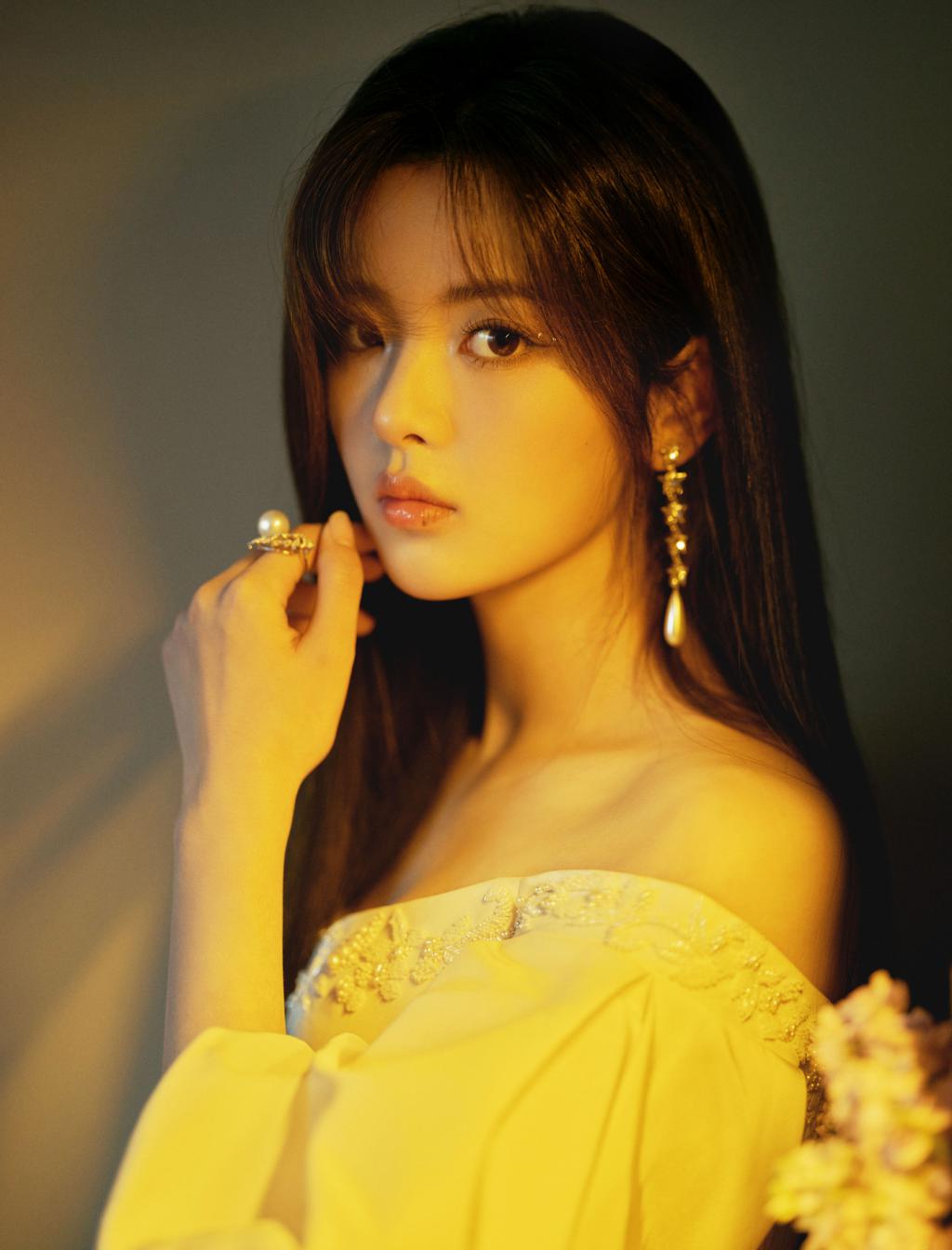 杨超越穿抹胸连衣裙拍大片 精致脸蛋好养眼