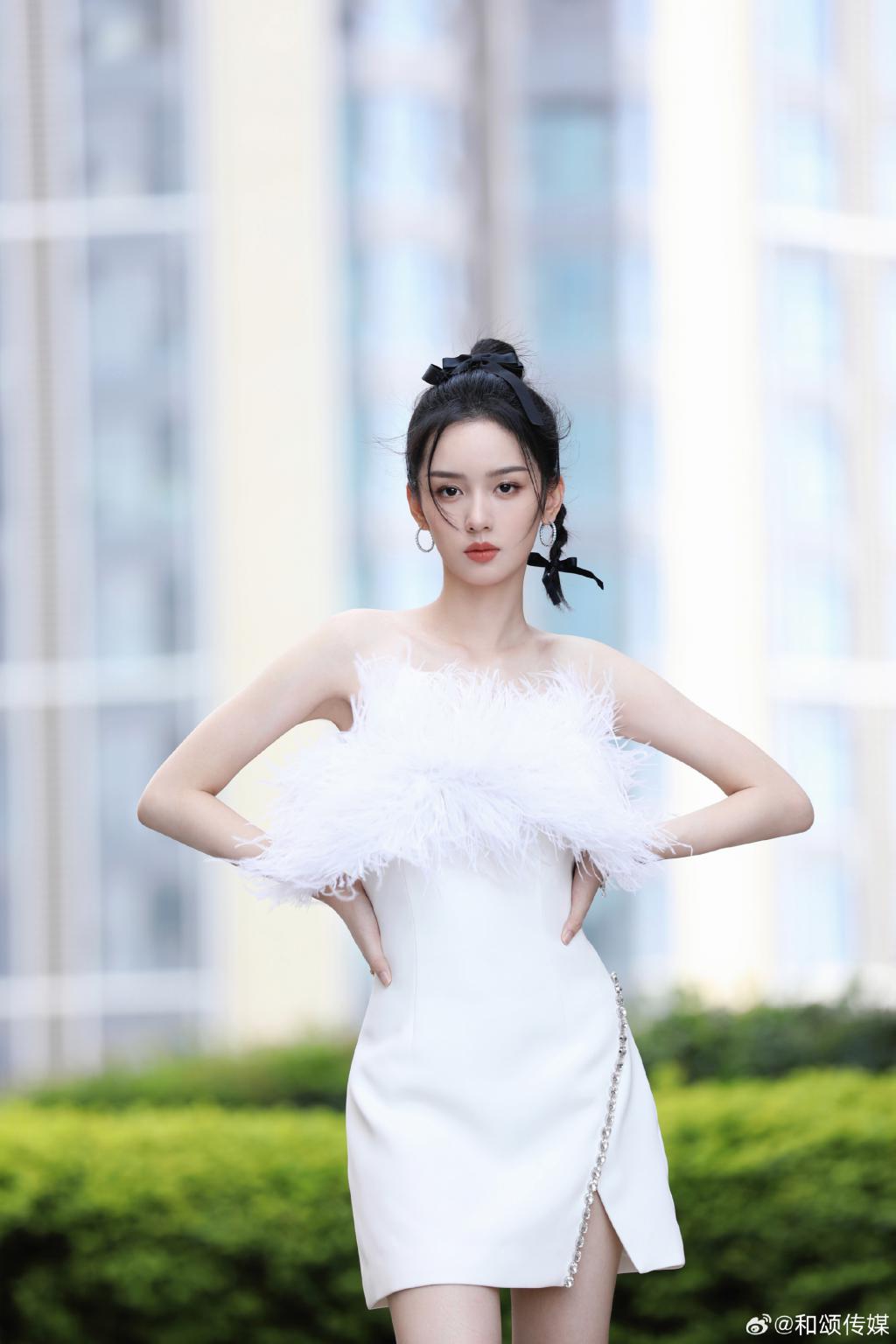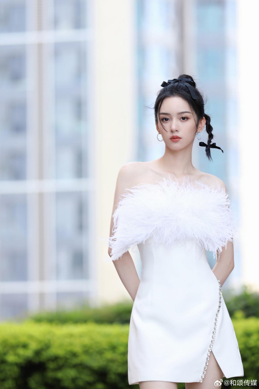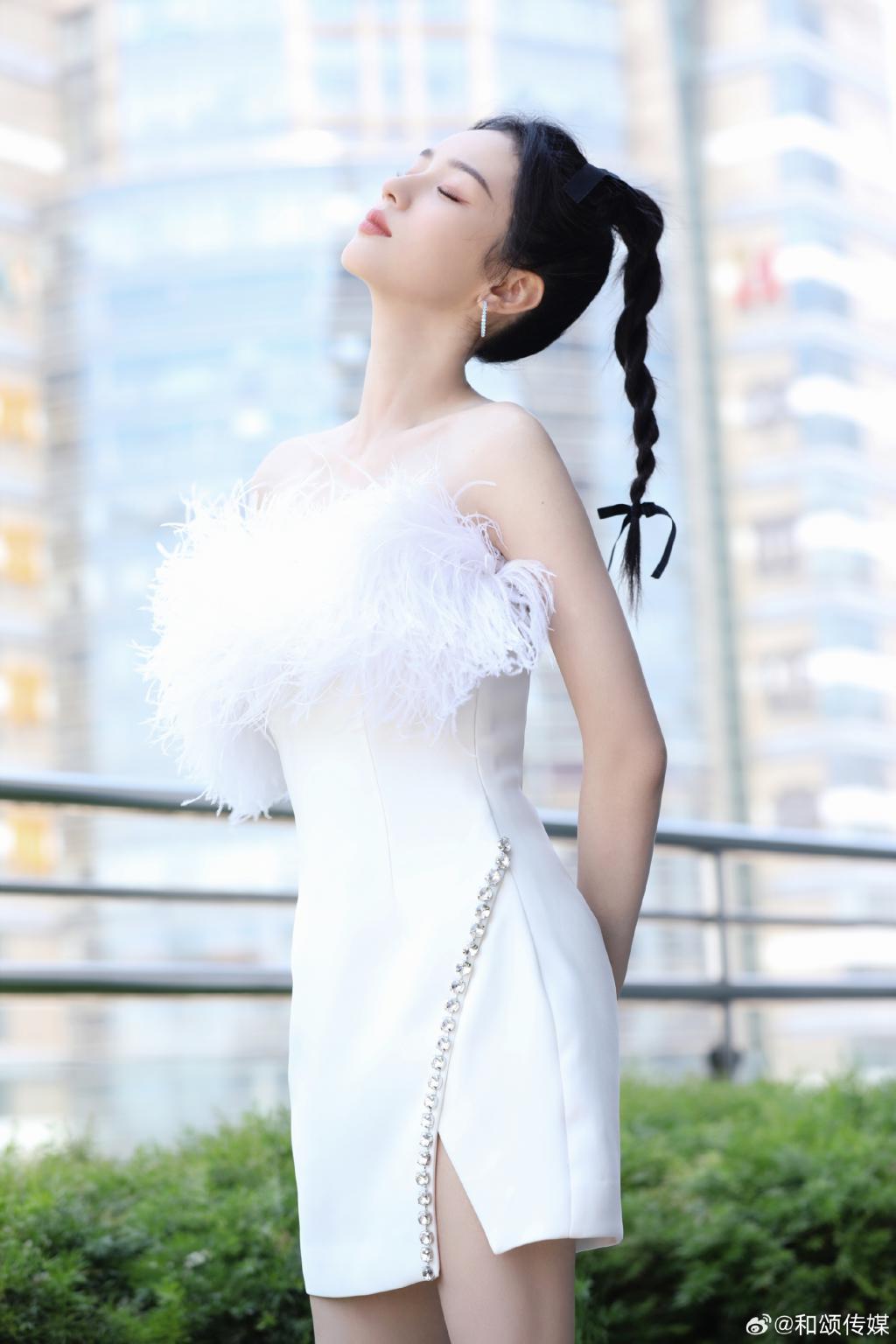 周也的一组美照曝光,她身穿白色羽毛抹胸裙,露出香肩美腿,肩颈线优越,高扎麻花辫俏皮灵动。