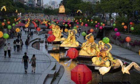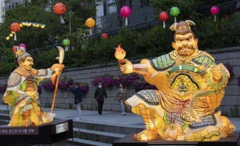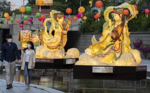 5月28日,人们在韩国首尔的清溪川欣赏展出的彩灯。 燃灯会是韩国的传统庆典。今年韩国首尔清溪川的燃灯会传统灯展5月20日开始,将于6月3日结束。