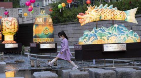 5月28日,一个小朋友在位于韩国首尔清溪川的传统灯展现场玩耍。