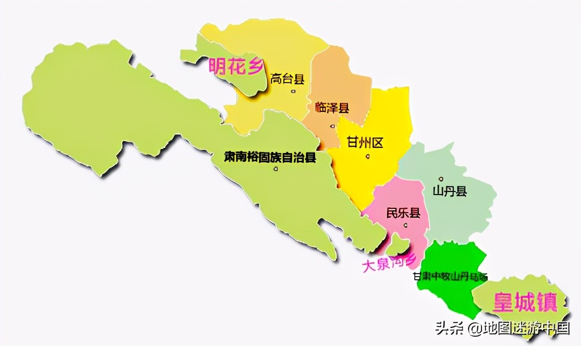 肃南县地图比较奇特,由四块互不相连的土地构成,除了主体,还有三块飞地分布于周围。一个是位于高台县西部明花乡,一个是位于民乐县南部大泉沟乡,还有最远的一个位于山丹县南部皇城镇。肃南县成立于1954年,裕固族农牧民由于居住相对比较分散,当时成立肃南裕固族自治县的时候,就出现了一些飞地,加上后来和青海省之间的一些区划调整,最终形成如今肃南县拥有三块飞地的情况。