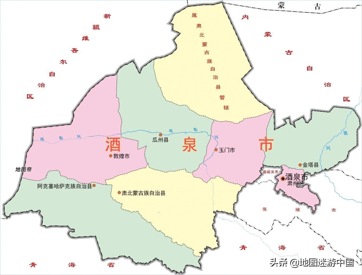 肃北县全称肃北蒙古族自治县,位于甘肃省西北部,河西走廊的西端,隶属于酒泉市。肃北县幅员辽阔,总面积约6.9万平方公里,比宁夏回族自治区还要大一点,但总人口仅有1.2万人。真正的地广人稀。肃北县主体位于酒泉市区的西部,北与玉门市和瓜州县为邻。从肃北县继续往北穿过玉门和瓜州,又到了肃北县的地界,这块土地与主体不相连,面积几乎和主体一样大小,这块儿飞地就是肃北县的马鬃山镇。