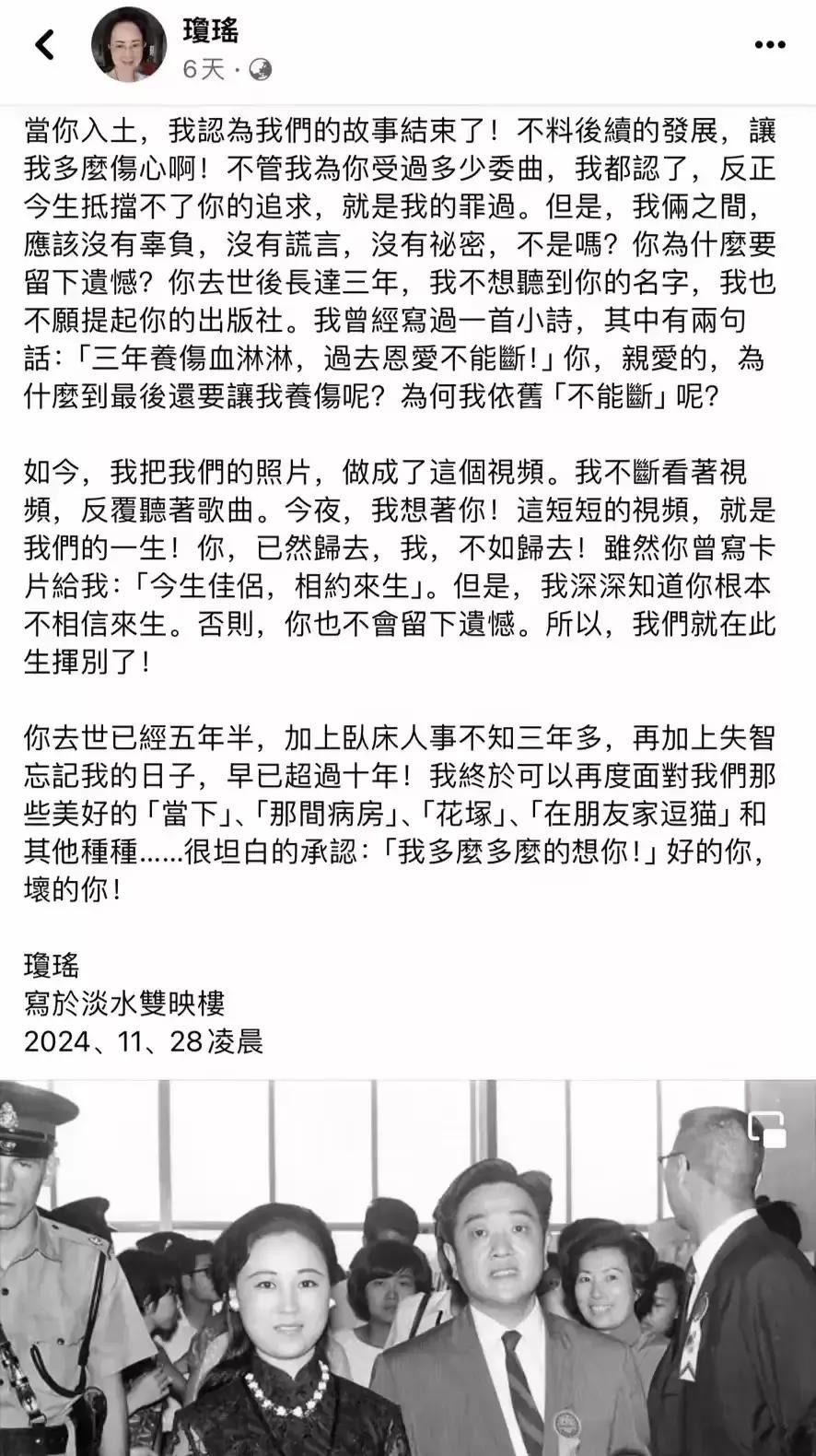 琼瑶在《悼亡夫》中说,你那么爱我,为什么要留下遗憾呢?你走后,我三年养伤血淋淋,可见平鑫涛的子女对琼瑶的伤害之深。