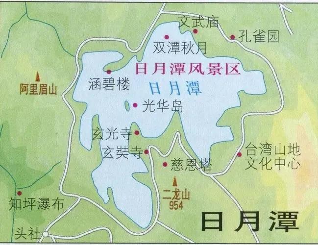 日月潭的古迹也多,北山腰有文武庙,潭西有孔雀园、潭南山麓有玄光寺,其后还有玄奘寺,而潭的东畔部则是高山族聚集之地,土风歌舞至今仍很盛行。
