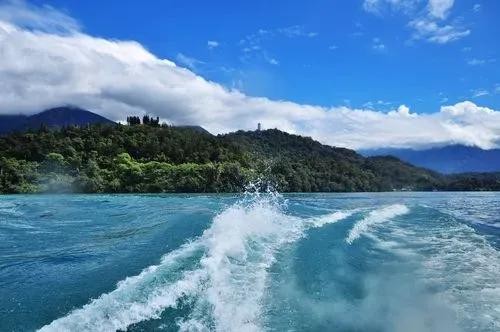 日月潭的风景是十分动人的。在碧黛的峰头山腰,朵朵白云缭绕飘动:湛蓝的湖心水面,点点扁舟,四季不断。