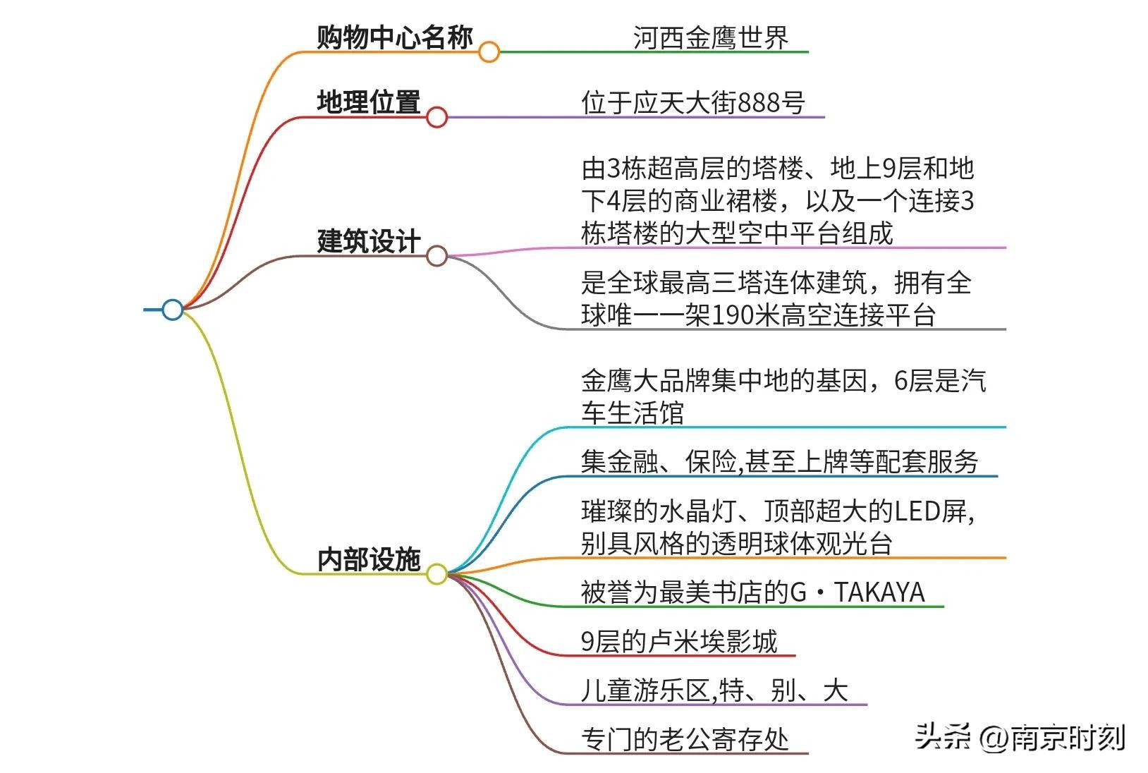 河西金鹰世界位于应天大街888号,是全球最高的三塔连体建筑,还拥有全球唯一一架190米高空连接平台。这可不是一般的建筑,它由3栋超高层的塔楼、地上9层和地下4层的商业裙楼,以及一个连接3栋塔楼的大型空中平台组成。它的内部面积近百万方,是亚洲单体面积最大的购物中心。