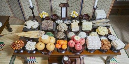 韩国和朝鲜祭祀的食物也略有不同。韩国的中秋祭桌大体上都是汤、汤、杯、饭等。 朝鲜虽然也按照4列的形式进行,但是2列中放有在韩国看不到的高粱饼、绿豆饼、红豆饼、蒸饼,这一点有所不同。 第三列也与南韩不同,以章鱼、明太鱼、两面水、鲽鱼、鱼饼为主。