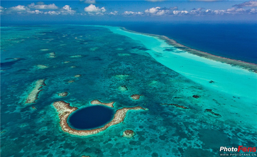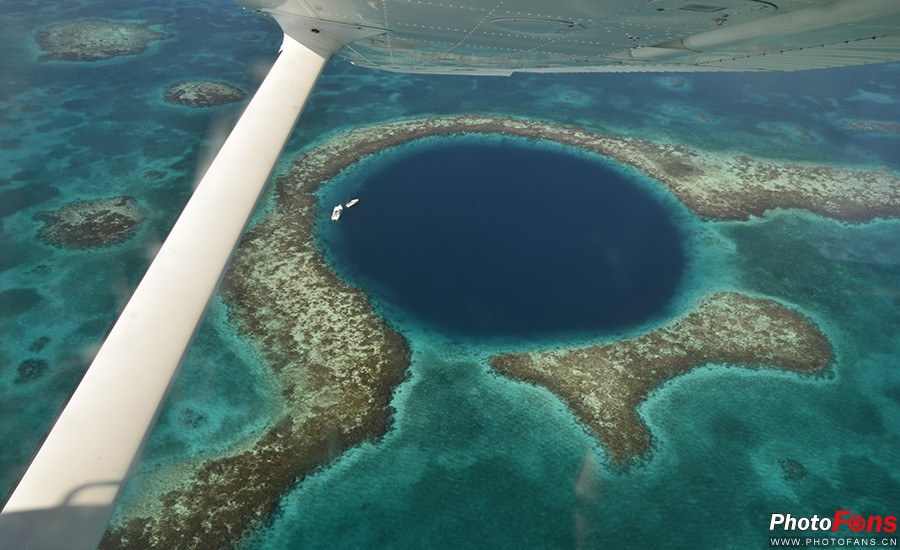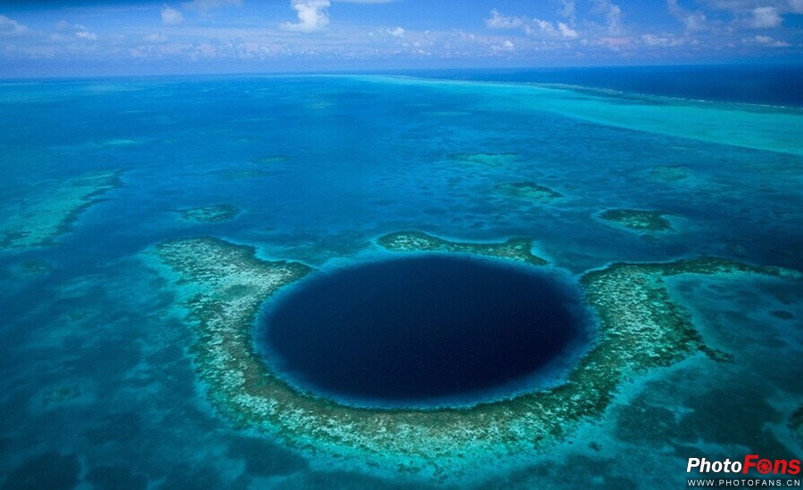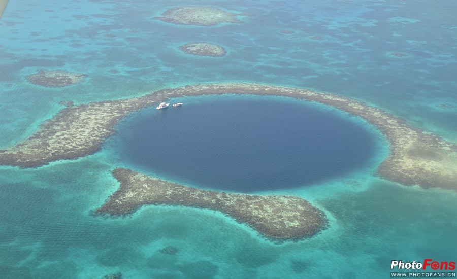 大蓝洞(Great Blue Hole)为一石灰岩洞也是目前已发现的全世界最大的水下洞穴,形成于海平面较低的冰河时代末期,后来因为海水上升,洞顶随之塌陷,遂变成水下石灰石坑洞穴。从高空俯瞰大蓝洞,洞口呈现近乎完美的圆形,又非常巧合地与合围的环礁重合。犹如一颗深海上的蓝宝石,神秘而又令人望而却步。而“大蓝洞”一名也因其的确是一个蓝洞而得名。