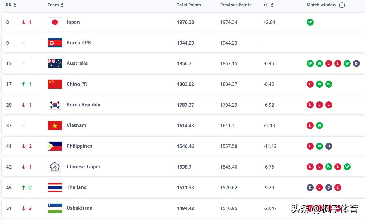 亚洲方面排名,日本女足居首,神秘之师朝鲜女足紧随其后,中国女足排名亚洲第4。