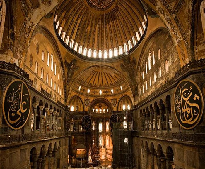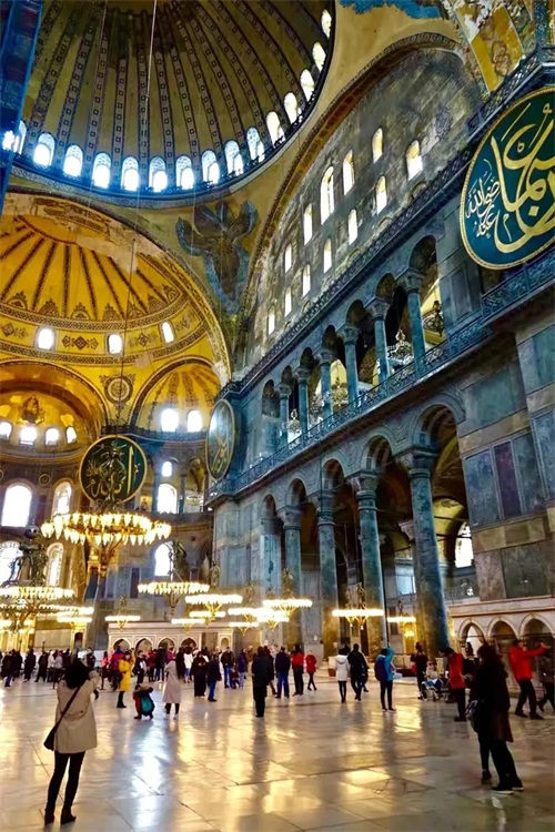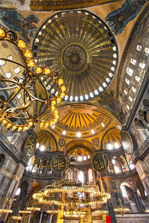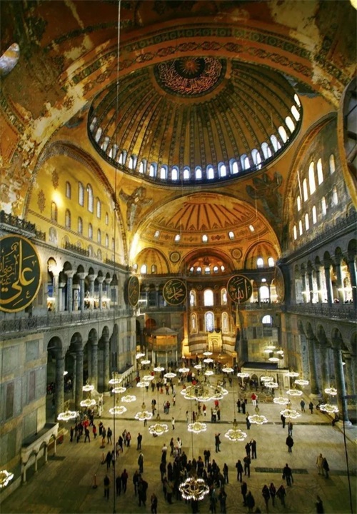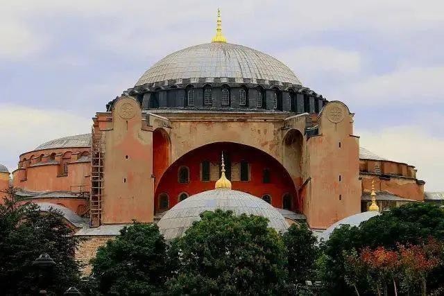 圣索菲亚大教堂现位于土耳其大城市伊斯坦布尔,建于公元532—537年,东西长77.0m,南北长71.7m,中心穹顶高达55m。距今已经约近1500的历史了。1935年改为博物馆,1985年列入世界文化遗产。2020年7月10日,土耳其总统宣布圣索菲亚博物馆将作为清真寺向民众开放。圣索菲亚大教堂曾是拜占庭帝国(东罗马帝国)最光辉的代表建筑作品,是东正教的中心教堂,是皇帝举行重要仪典的场所,距离海岸线非常近,四方来的船只在海上都能望见它,是拜占庭帝国极盛时期的纪念碑,它是在老教堂的基础上新建起来的,老教堂曾因平民暴动而毁掉,查士丁尼皇帝在老教堂损毁40天后就着手重建。
