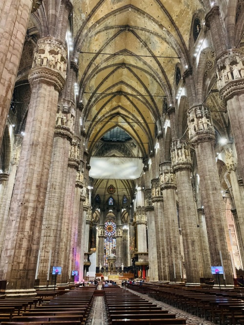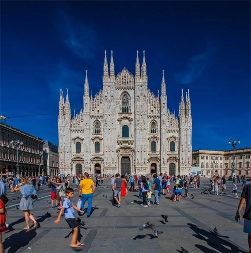 米兰大教堂是世界上最大的哥特式教堂,也是规模仅次于梵蒂冈圣彼得大教堂的世界第二大教堂。于公元1386年开工建造,1485年完成主体拱顶,后续又在1774年中央塔上的镀金圣母玛丽亚雕像就位。1897年最后完工,主体建造持续100年,再加上外部装饰及雕像最终建成历时500多年。坐落于米兰市中心的大教堂广场,教堂长158米,最宽处93米。塔尖最高处达108.5米。总面积11700平方米,可容纳35000人。米兰大教堂整个外观极尽华美,主教堂用白色大理石砌成,是欧洲最大的大理石建筑之一。 米兰大教堂不仅是米兰的象征,也是米兰的中心,同时也是意大利天主教米兰总教区的主教堂。拿破仑曾于1805年在米兰大教堂举行加冕仪式。1991年被联合国教科文组织列为世界文化遗产。
