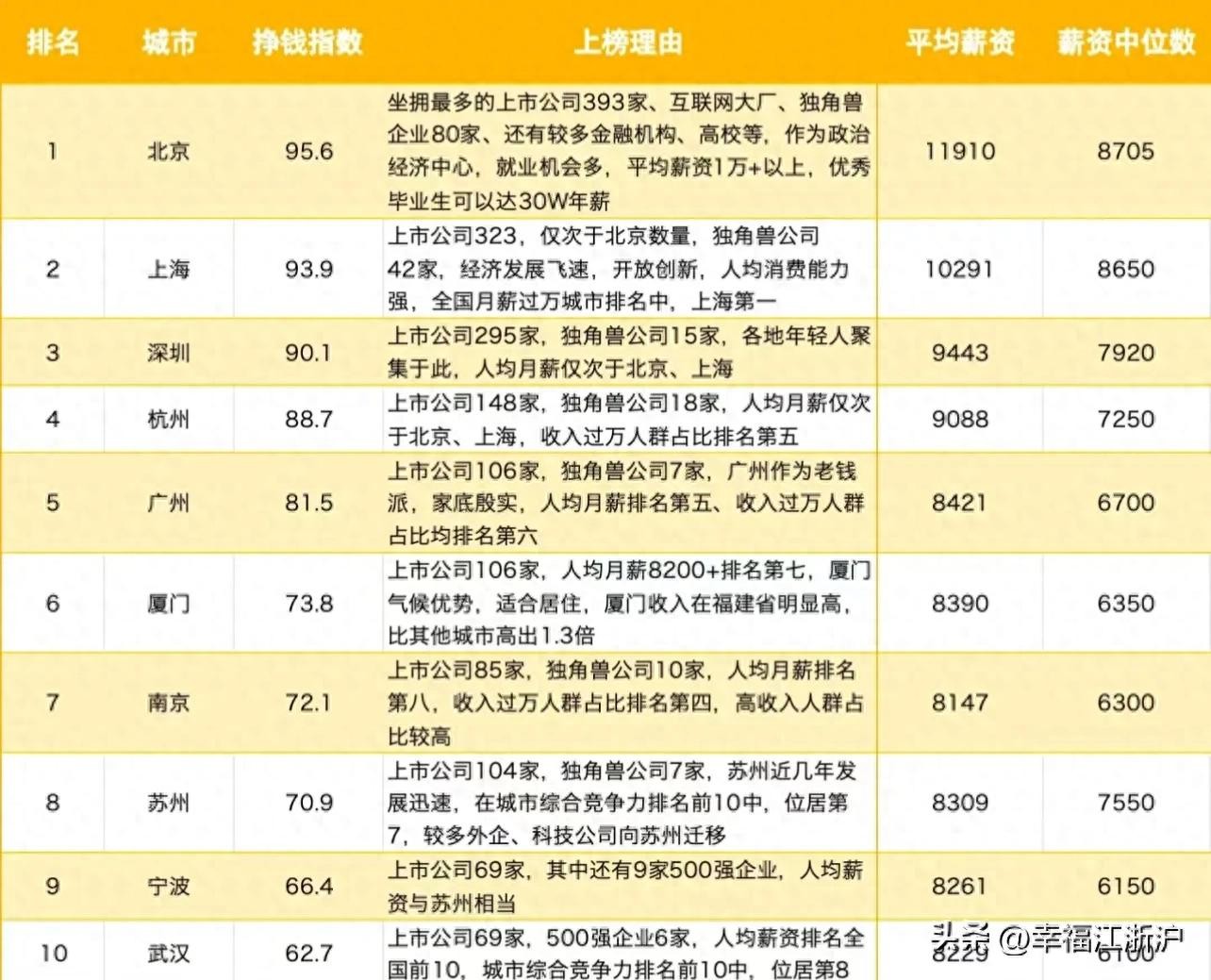 杭州:电商之都,阿里巴巴和淘宝的出生地,互联网高薪岗位多。