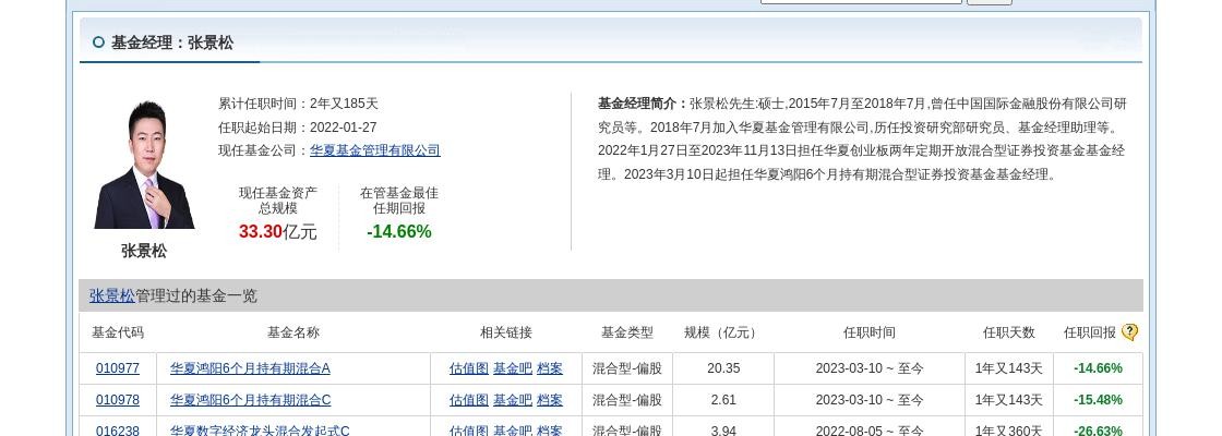 简历显示,张景松先生:硕士,2015年7月至2018年7月,曾任中国国际金融股份有限公司研究员等。2018年7月加入华夏基金管理有限公司,历任投资研究部研究员、基金经理助理等。2022年1月27日至2023年11月13日担任华夏创业板两年定期开放混合型证券投资基金基金经理。2023年3月10日起担任华夏鸿阳6个月持有期混合型证券投资基金基金经理。