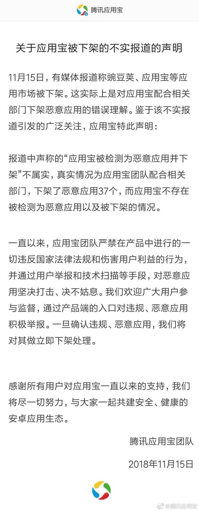 声明还表示,真实情况为应用宝团队配合相关部门下架恶意App应用37个,而应用宝并未被检测为恶意App或“被下架”处理。