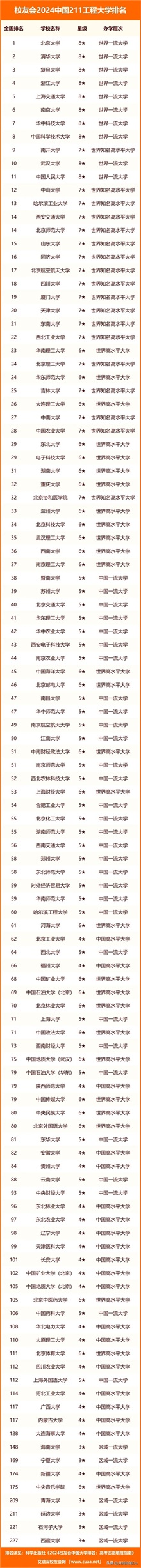 从校友会2024年211大学排名来看,排名靠后的30所末流211大学排名如下: