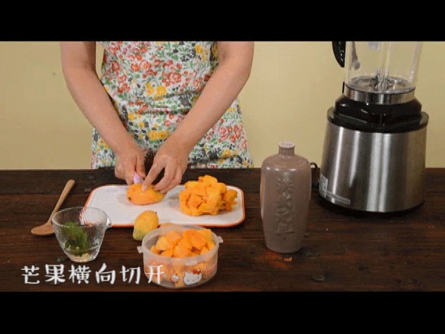 冷冻芒果肉200g,新鲜芒果1个,陈醋5g,薄荷叶2枚
