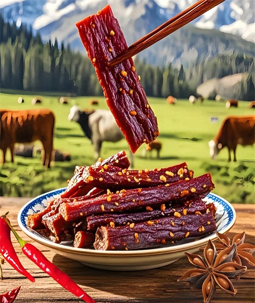 内蒙古风干牛肉干非常著名,不仅在当地享有盛名,还远销国内外,是内蒙古的标志性特产之一。风干牛肉干在古时候是蒙古铁骑的军粮,方便携带且富含营养,被誉为“成吉思汗的行军粮”。