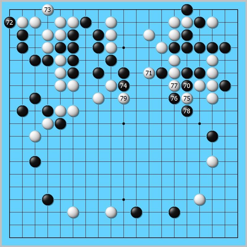 实战图八:白71到白79弈得紧峭有力,深得缠绕攻击之要领。