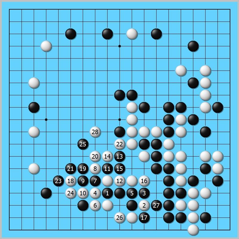实战图十:到白28跳,白棋以攻代守的战略战术明显成功。