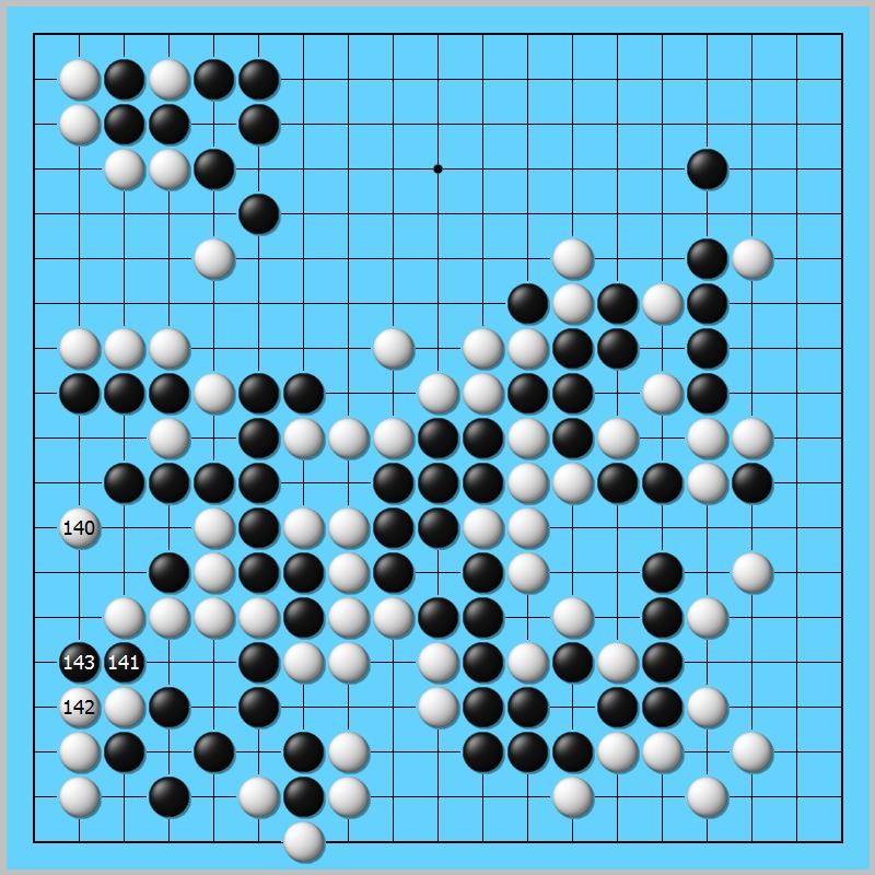 实战图二:施襄夏白140飞如果改在下一路尖,范西屏是一点辙都没有,现在一路之差,黑棋找到了起死回生的手段,141打后143挡下,这是妙手,起死回生的妙手。