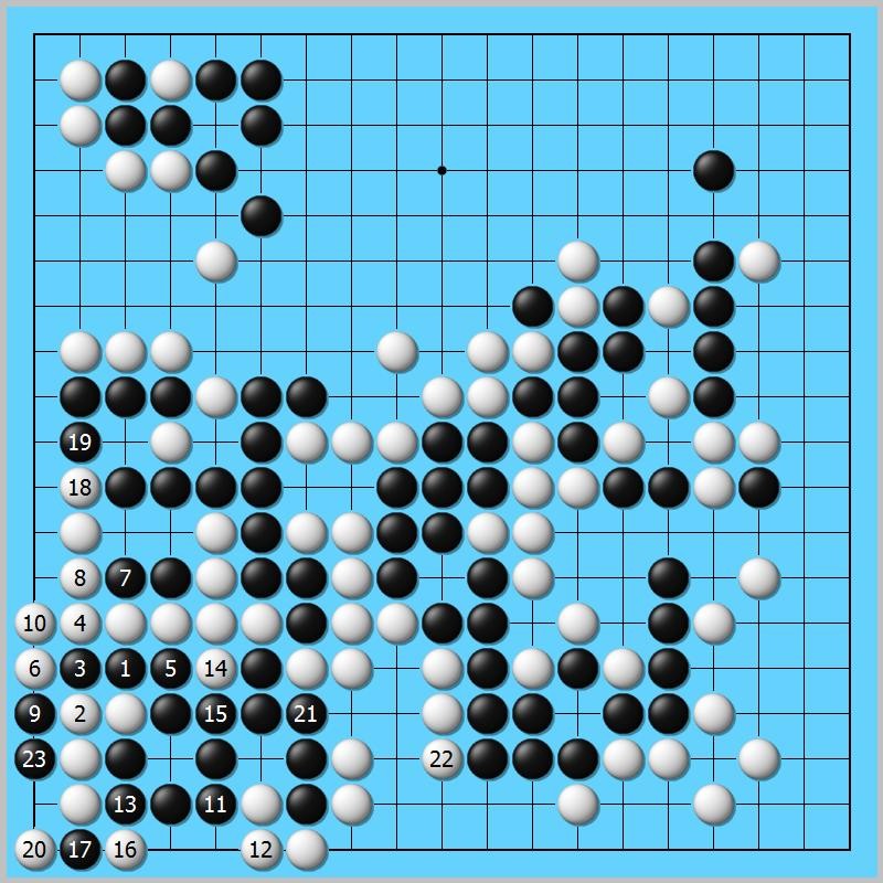 到23扑,黑棋已经活出。本局范西屏执黑7子半逆转胜。