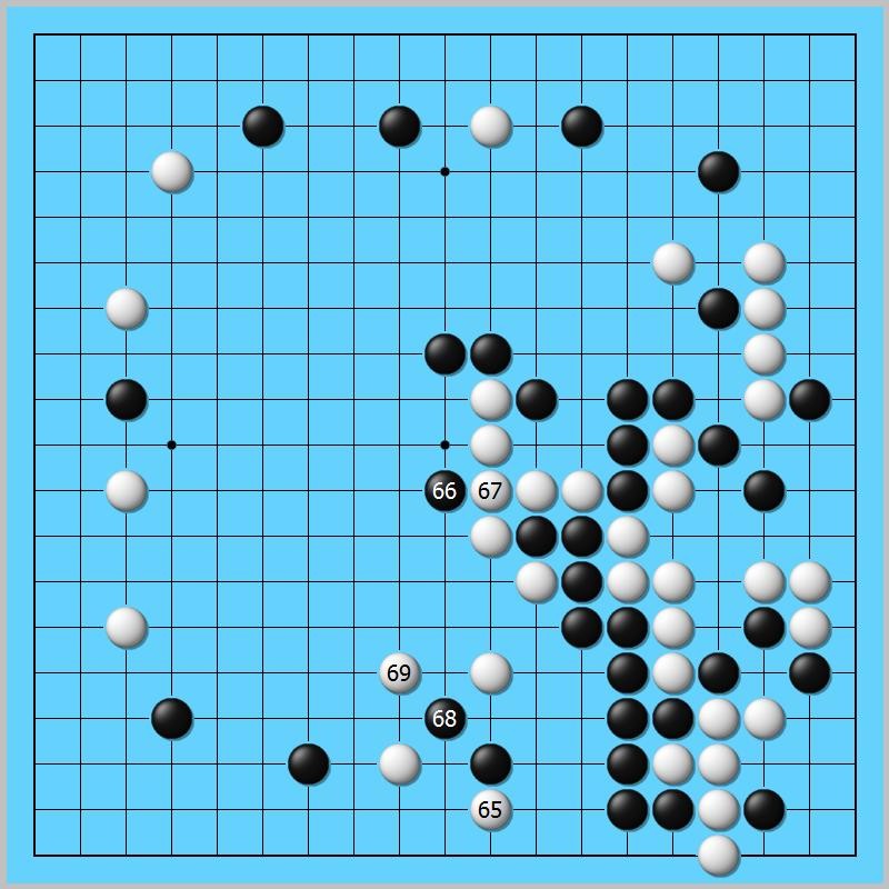 实战图九:白65二路托,期待整形。黑68反击,白69是与白65相关联的好手。