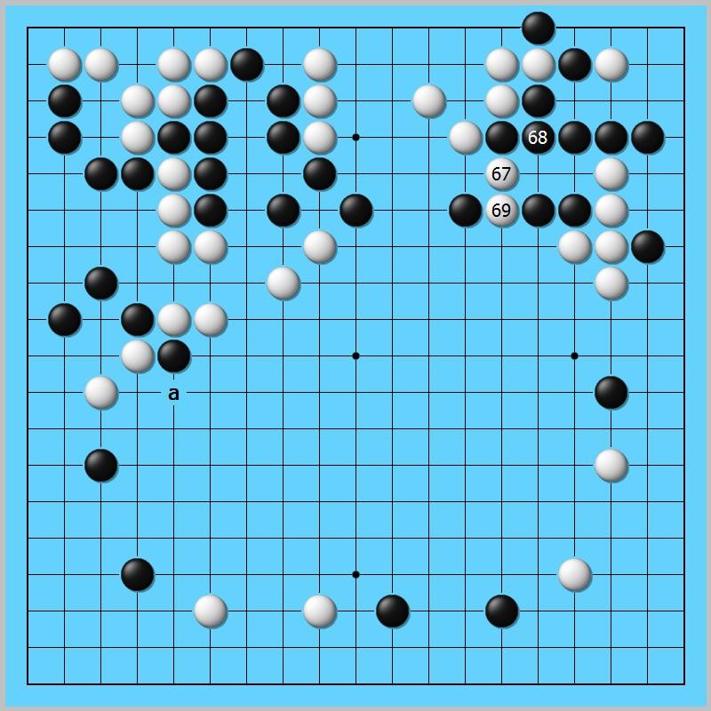 白67如在a位抱吃一子,便可获得明显优势,但这样似乎不符合古代棋手的好战风格。白67、69强烈无比!