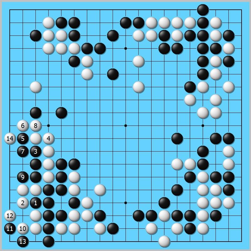 实战图六:黑12吃住白三子,胜势明朗化了。这局棋范西屏捕捉战机的能力非同一般。