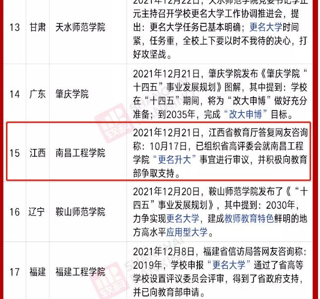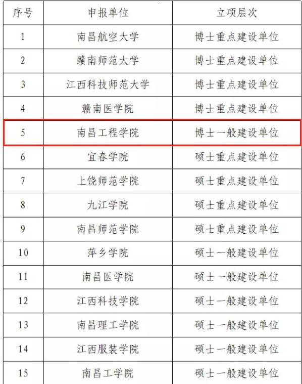 南工目前有1一个国家一流本科专业建设点和一个国家特色专业建设点。建有鄱阳湖流域水工程安全与资源高效利用国家地方联合工程实验室和6个省部级科研平台;根据江西省教育厅的“十四五”新增博士硕士学位授予单位立项规划建设名单列表看,南工不是首批更名升大的在列院校;该校的申博是一般立项单位。可见省里对最近两年南工更名大学的态度比较暧昧。首先支持的肯定是申博重点立项单位;不过目前的南工也没有完全满足更名升大的条件。