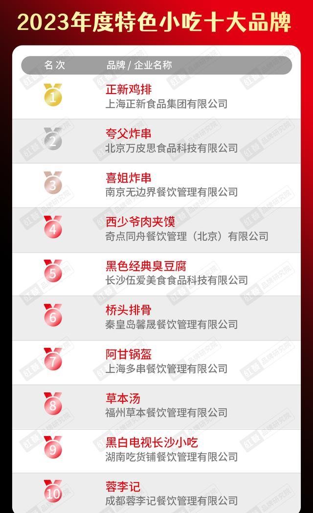 (七)2023年十大特色小吃、炖品、烘焙食品品牌“2023年,正心炸鸡依然排名第一,也在快速扩张之列。西烧野肉夹馍将于2023年初重新开业加盟,计划加快运营,进军北美市场。一个上市品牌今年年。