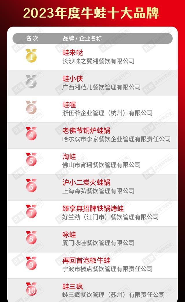 (九)2023年十大蛙蟹及日本食品品牌随着消费市场牛蛙数量不断扩大,红餐品牌研究院今年刚刚编制了“2023年十大牛蛙品牌”榜单。上榜品牌包括Valeda、Frog Boy、Frog、老佛爷Frog Pot、淘娃等。