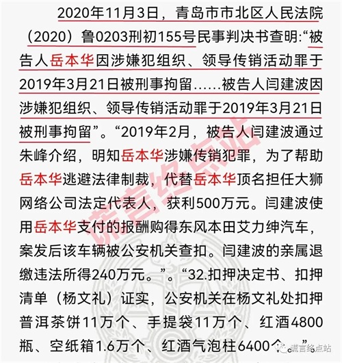 2、2020年11月3日,青岛市市北区人民法院已就青岛大狮岳本华等人传销案(案号(2020)鲁0203刑初155号)审理完毕,下达判决书。其中:被告人岳本华因涉嫌犯组织、领导传销活动罪于2019年3月21日被刑事拘留。