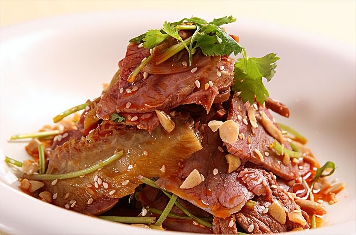 3. 夫妻肺片:夫妻肺片是成都的一道传统名菜,由一对夫妻档创制而得名。这道菜以牛头皮、牛舌、牛肚、牛心、牛肉为主料,制作精细,调味独特,口感麻辣鲜香,深受人们喜爱。