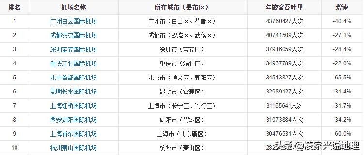 2020年,中国241座颁证民用运输机场年旅客吞吐量排名前十的机场名单(数据)如下表所示:
