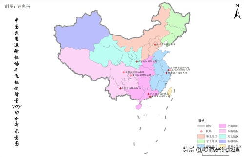 中国民用运输机场年飞机起降量TOP10名单空间分布示意图