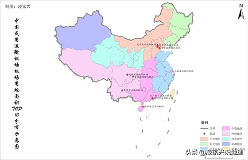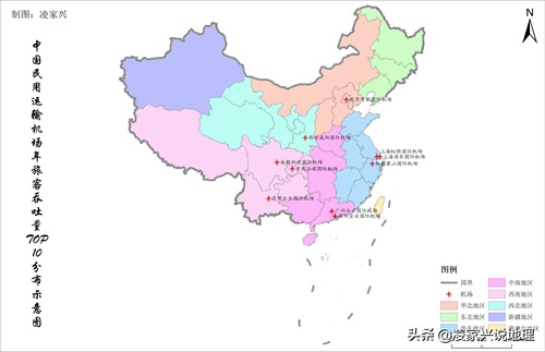 中国民用运输机场年旅客吞吐量TOP10名单空间分布示意图