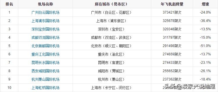 2020年,中国241座颁证民用运输机场年飞机起降量排名前十的机场名单(数据)如下表所示:
