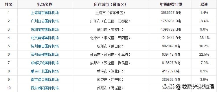 2020年,中国241座颁证民用运输机场年货邮吞吐量排名前十的机场名单(数据)如下表所示: