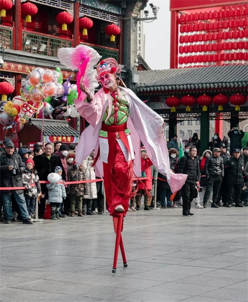 6.踩高跷:踩高跷是一种传统的民间游戏,元宵节踩高跷的寓意是高瞻远瞩和步步高升,“高跷”谐音是“高瞧”,蕴含着人们对未来的祈盼,踩高跷时,人们身体升高,因此也象征着生活和事业不断进步,步步高升!