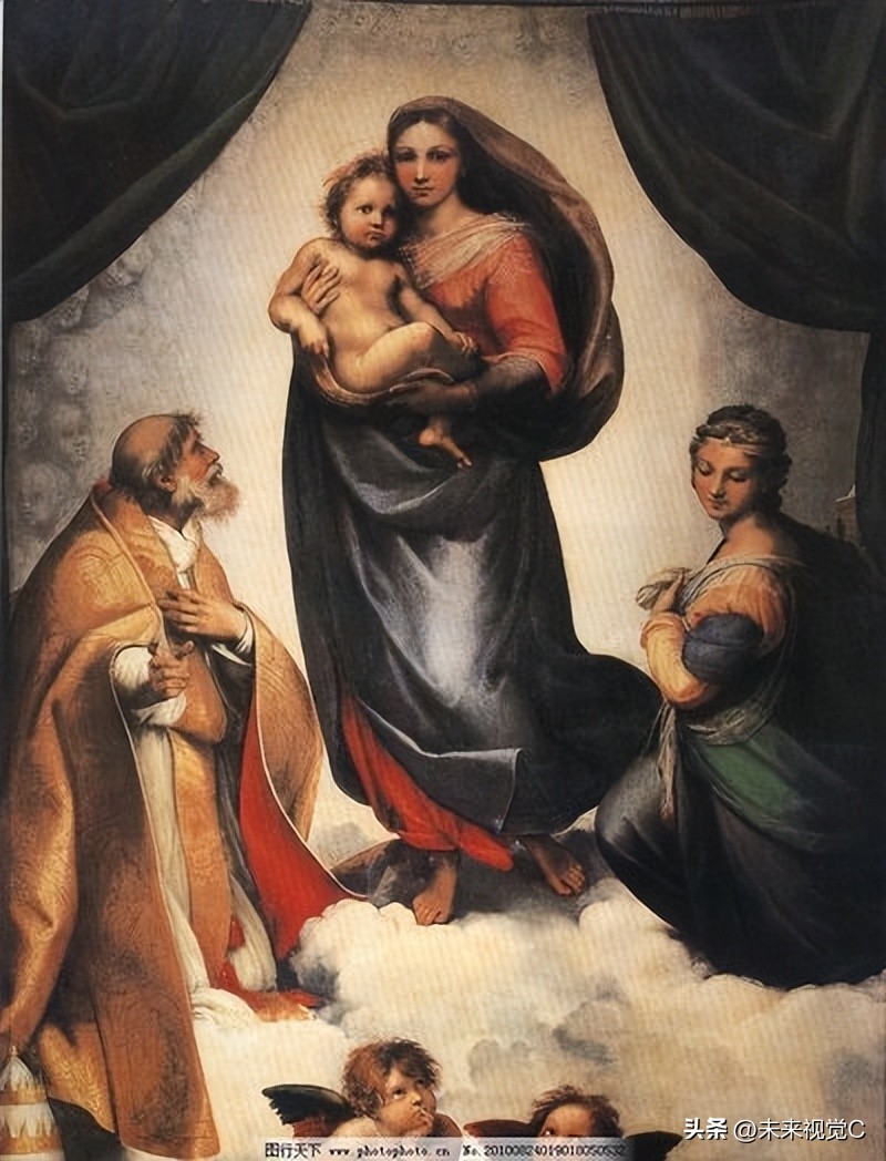 作者:拉斐尔・桑西馆藏:现收藏于德国德累斯顿茨温格博物馆古代艺术大师馆特色:是拉斐尔为纪念教皇西克斯特二世而重建的罗马西斯廷教堂内的礼拜堂而创作的一幅油画。画中的圣母面容秀丽而沉静,眉宇之间似有隐忧,怀中抱着婴儿基督从云中冉冉降落,构图庄重,色彩和谐,体现了文艺复兴时期的人文主义精神。