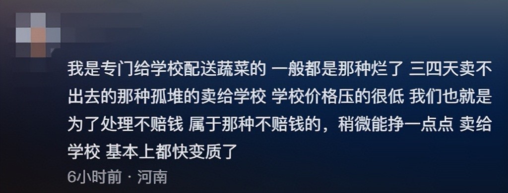 我是专门给学校配送蔬菜的,一般都是烂了,三四天卖不出去的,学校价格压的很低。