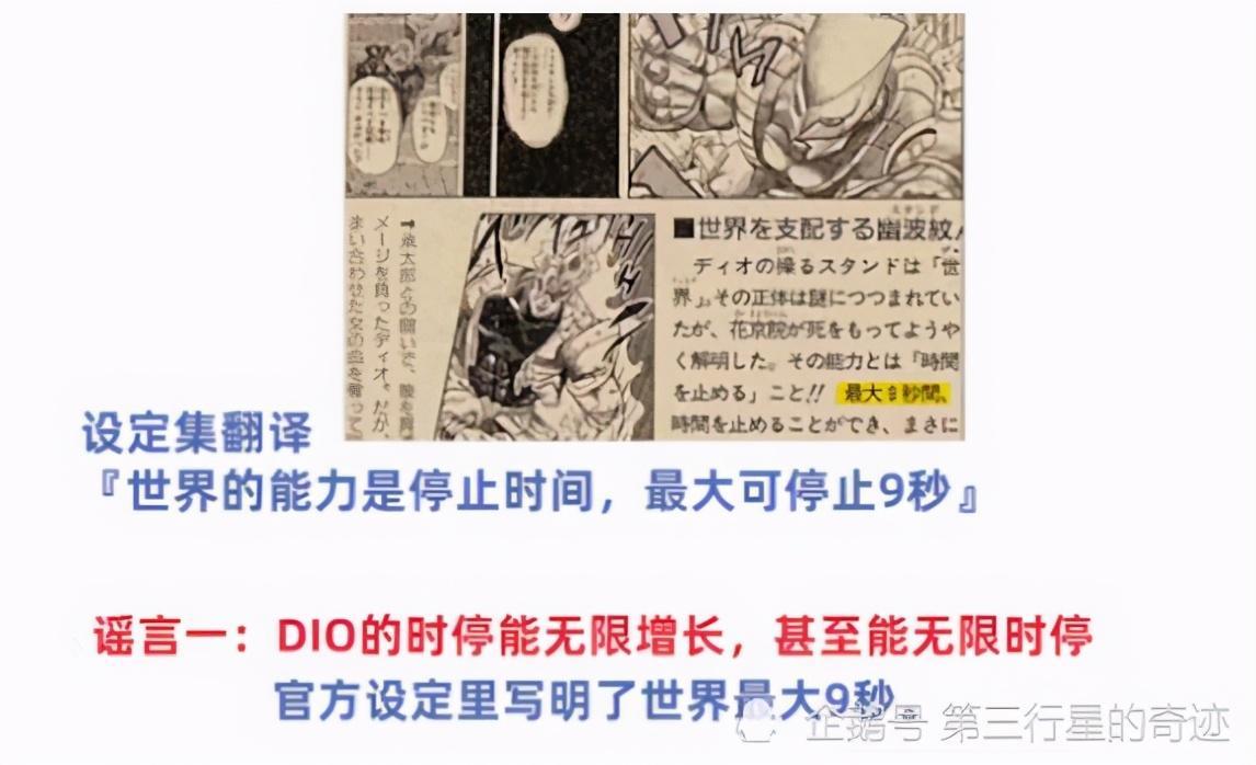 在剧中,根据DIO所说的话可以得知,在刚觉醒时停时仅能暂停一刹那的时间,随着颈部的伤痕越来越浅,能够暂停的时间也越来越长,总有一天能够完成更长时间的时停。并在吸收了乔瑟夫的血之后,能够将时停延长至9秒,这就使粉丝们认为如果DIO能一直活下去,时停时间能够无限延长。