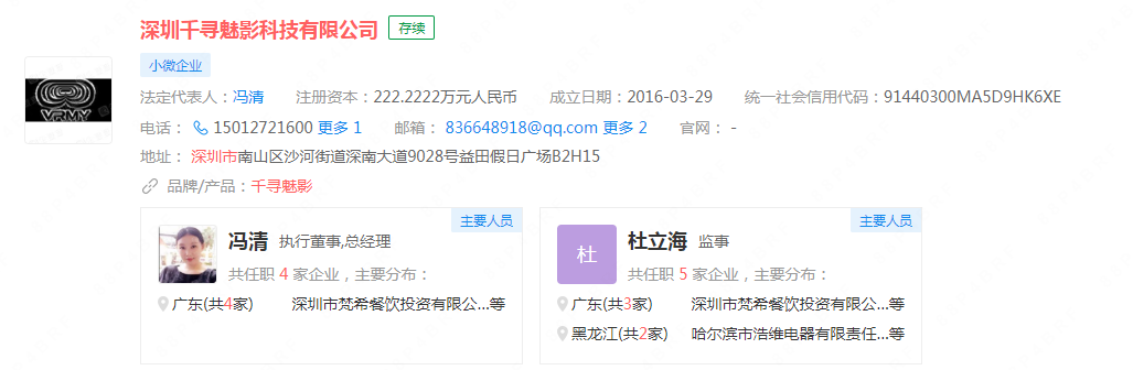 接着小编又去查了查冯清的企业,发现她旗下的公司深圳千寻魅影科技有限公司是2016年3月份成立的,巧合的是,2016年8月,王宝强就发布了和马蓉的离婚消息,虽然损失了不少钱,但是最终却能够从这段婚姻里全身而退。