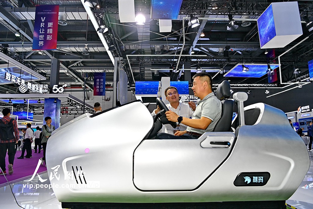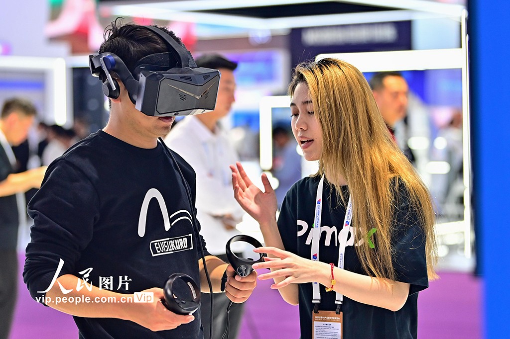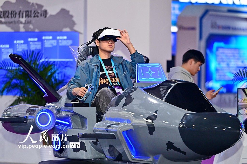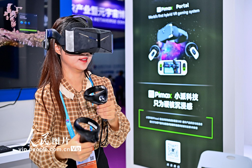 2023年10月19日至20日,2023世界VR产业大会在江西南昌举行,本届大会以“VR让世界更精彩——虚实融合,智兴百业”为主题,吸引了20多个国家和地区的6000余名专业观众、行业专家、企业家参加此次大会,并开发了众多创新应用场景,包括元宇宙会场、虚拟主持人、服务数字人、VR带看(产业展现+乡村振兴)、VR明信片海报等。朱海鹏摄(人民图片网)
