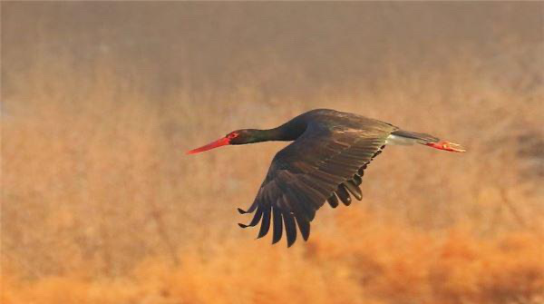 黑鹳,这种鸟和白鹳相对应,它们的全身的羽毛都是黑色的,它们是一种非常聪明机灵的鸟类,这种鸟主要生活在浅水、沼泽区域,小鱼儿是它们主要的食物,它是俄罗斯的国鸟。