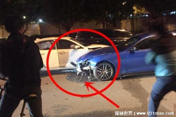 这是一个车祸现场的照片,在照片中一辆白色车和一辆蓝色车相撞,其中蓝色车的车头损坏严重,细心的人发现,在白色车子的前车窗上倒映着一张人脸,看着非常的吓人。