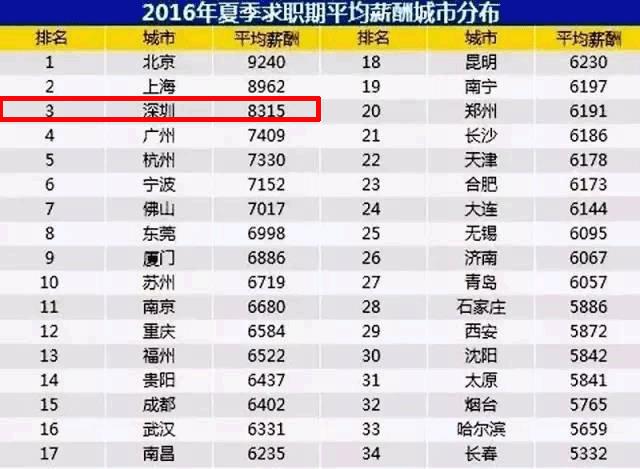 深圳夏季平均工资8315元