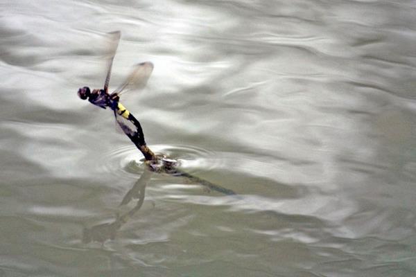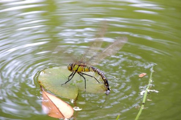 而且并不是所有的蜻蜓都会水中产卵的,比如一种常见的黄蜻,雌性呈现黄色,广泛的分布于我国的各个地区,它一般是将卵产在池塘附近的茎叶上,孵化后便会进入水中。还有玉带蜻会停歇在水面漂浮物上,在将卵产在漂浮物的水下部分,但是不会出现蜻蜓点水的动作。
