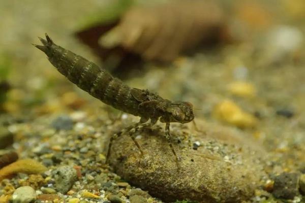 蜻蜓的幼虫是完全生活在水中的,叫做水虿,它通过压缩腹部,就能向后喷射出一股强大的水流,身体就借力向前冲去,主要依靠器官鳃呼吸,至少需要1年的时间,才能羽化成蜻蜓成虫,多的甚至需要7-8年,这时,水虿就会爬上石头或者植物,飞离水面。