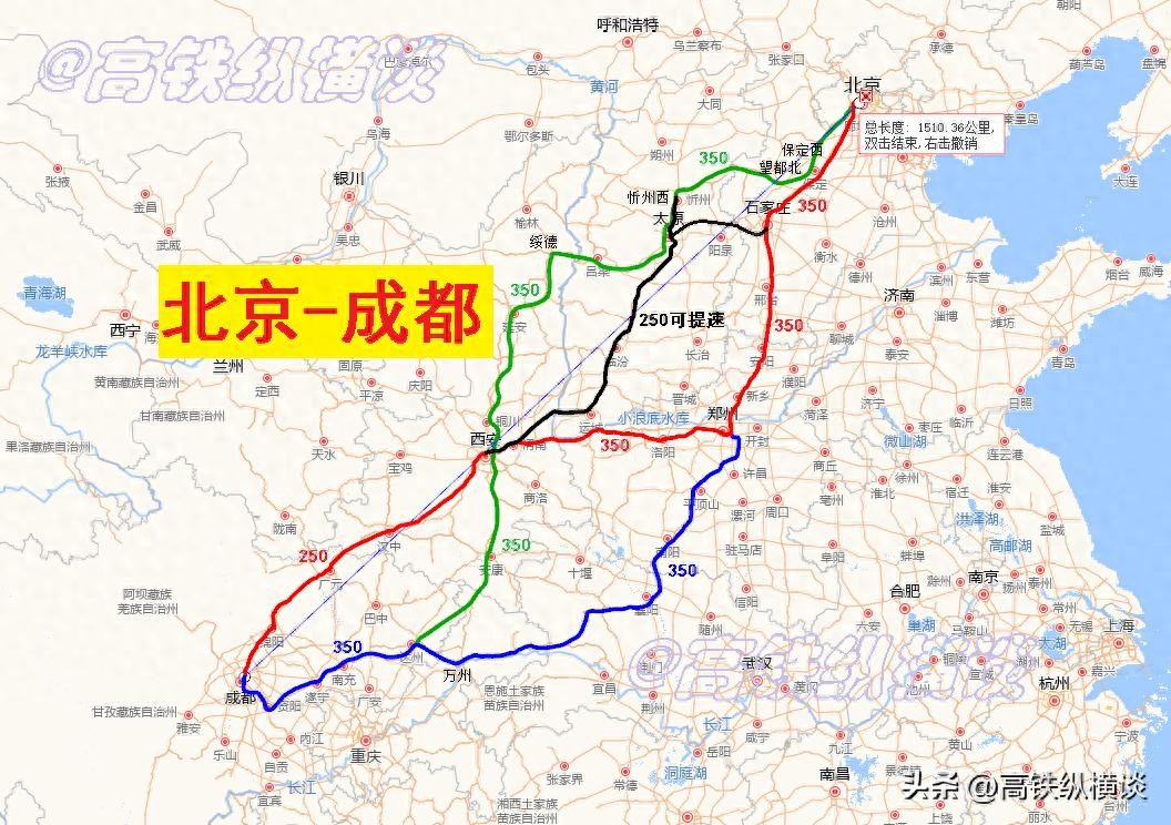 北京至成都的直线距离约1510公里,相距遥远,但将来坐高铁预计有5条线路,如上图所示,本文详细介绍北京至成都的5条高速铁路情况。